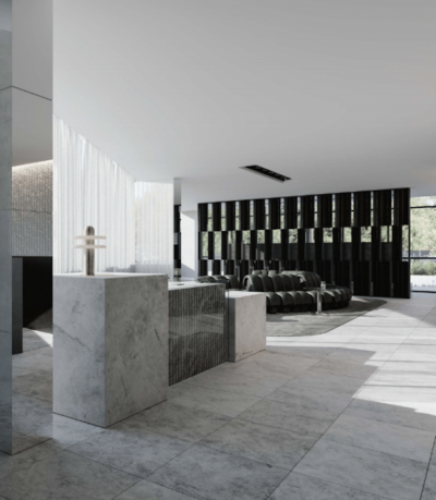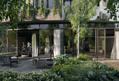 In the garden plaza below, an ornate yet contemporary landscape design creates a sense of occasion on arrival for residents and guests alike. This building reimagines how a building can integrate with its surroundings.